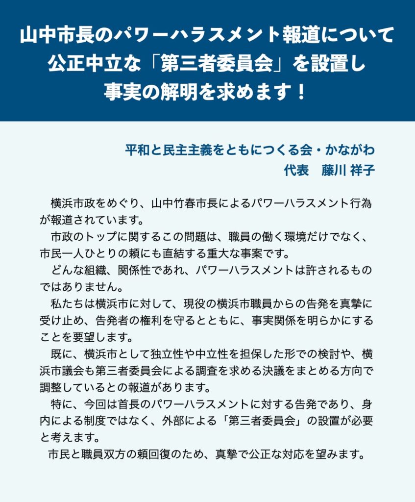 私たち「平和と民主主義をともにつくる会・かながわ」(代表 藤川さちこ)は、報道されるパワハラが事実であれば看過できない問題であり、直ちに、公正中立な「第三者委員会」を設置し、事実の解明が必要と考えます。